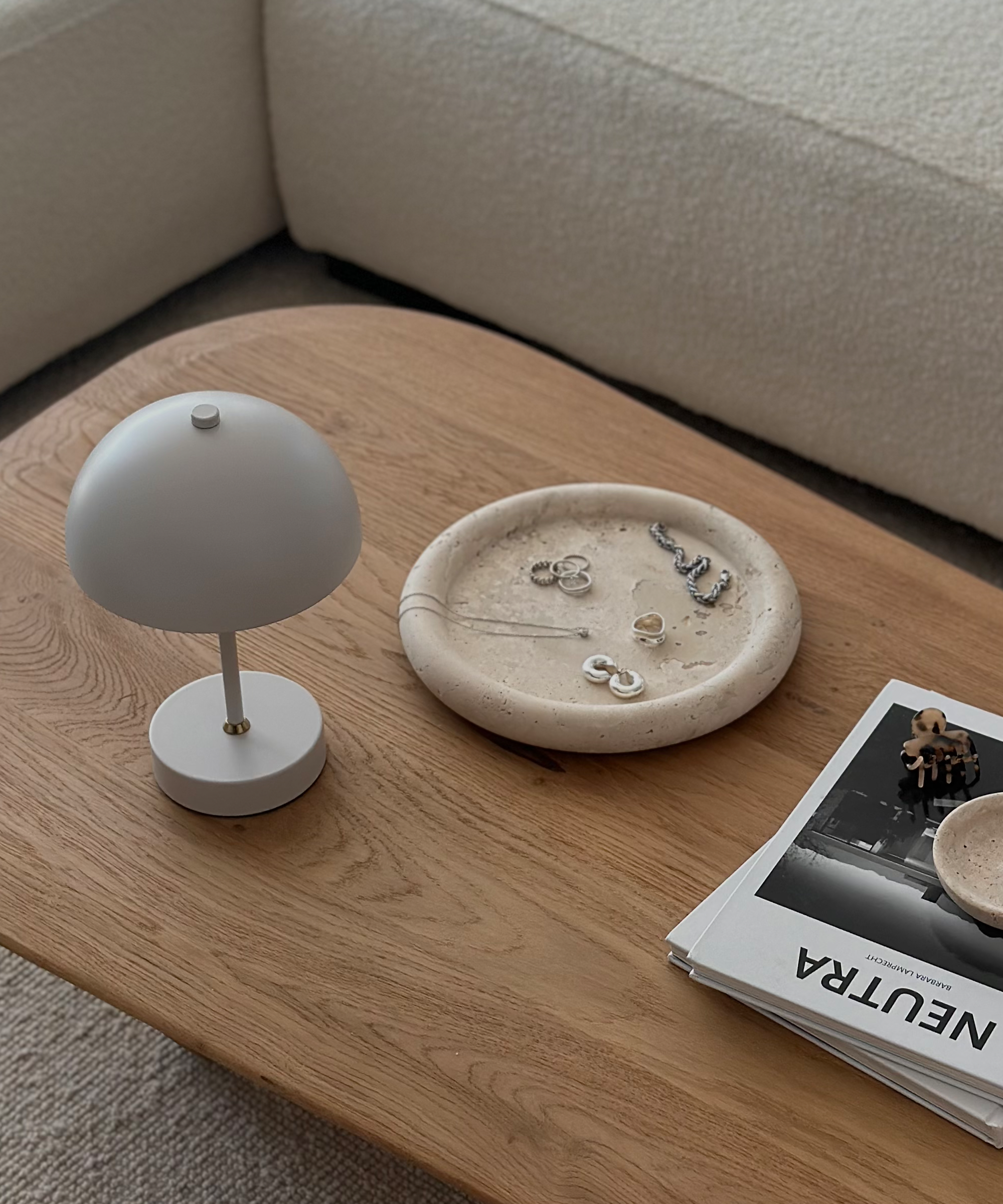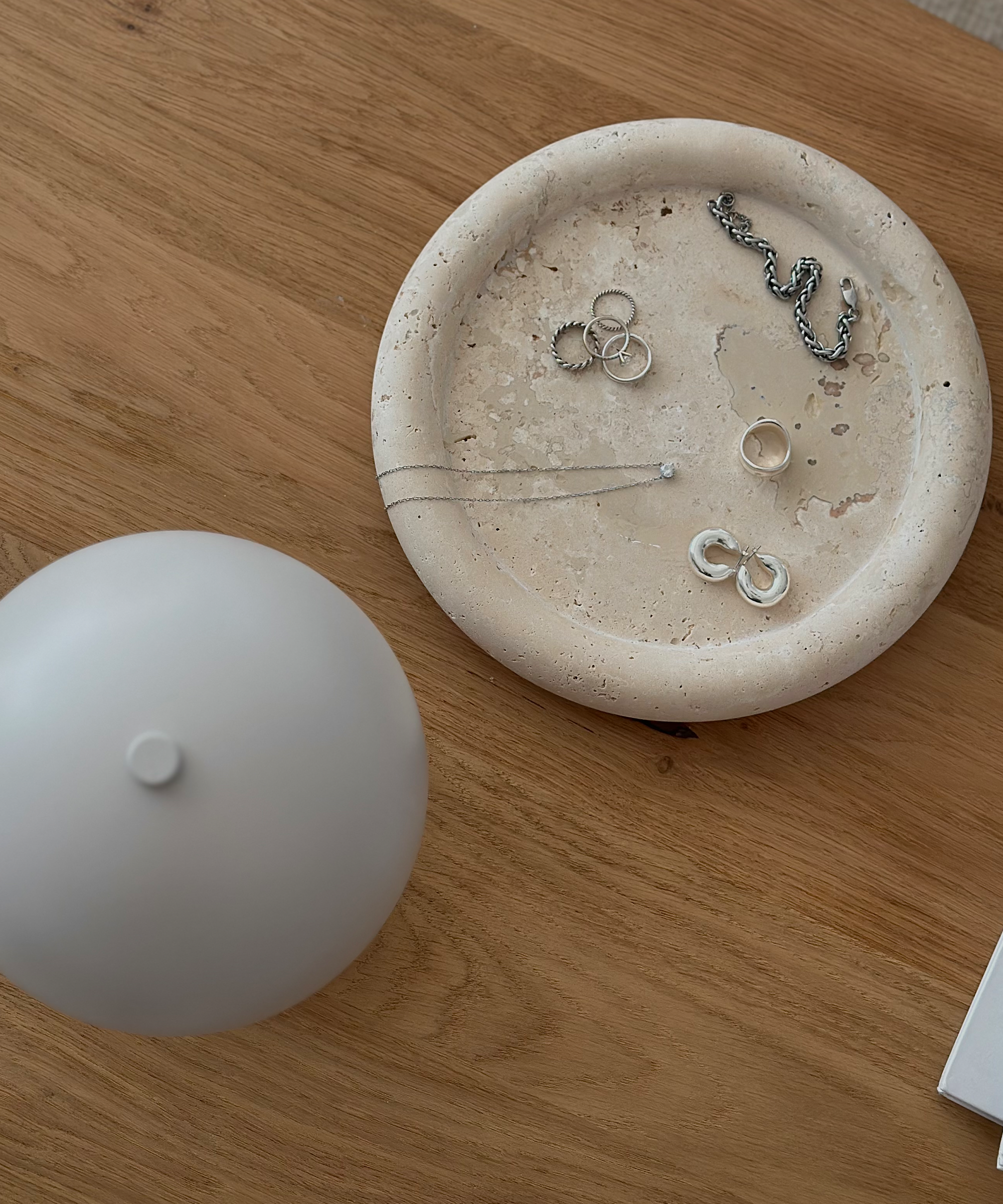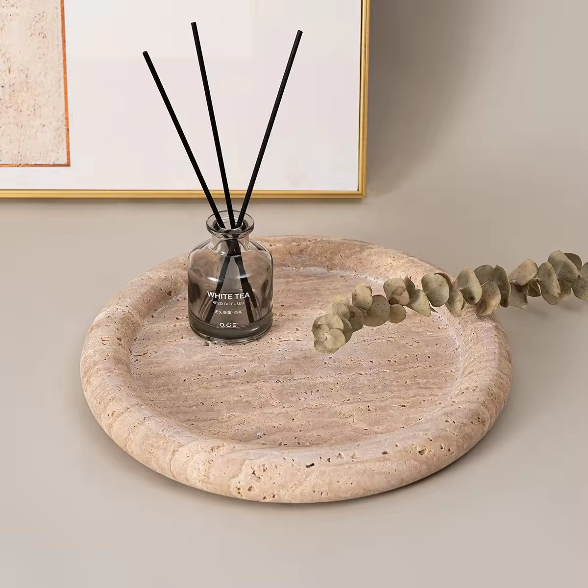 The Luna Travertine Tray, a refined round decorative piece crafted from natural travertine stone and inspired by the moon in the night sky. Its smooth surface and elegant texture make it perfect for organizing jewelry or displaying cherished items, adding a subtle touch of sophistication to any room. Durable and timeless, this tray blends functionality with understated luxury.